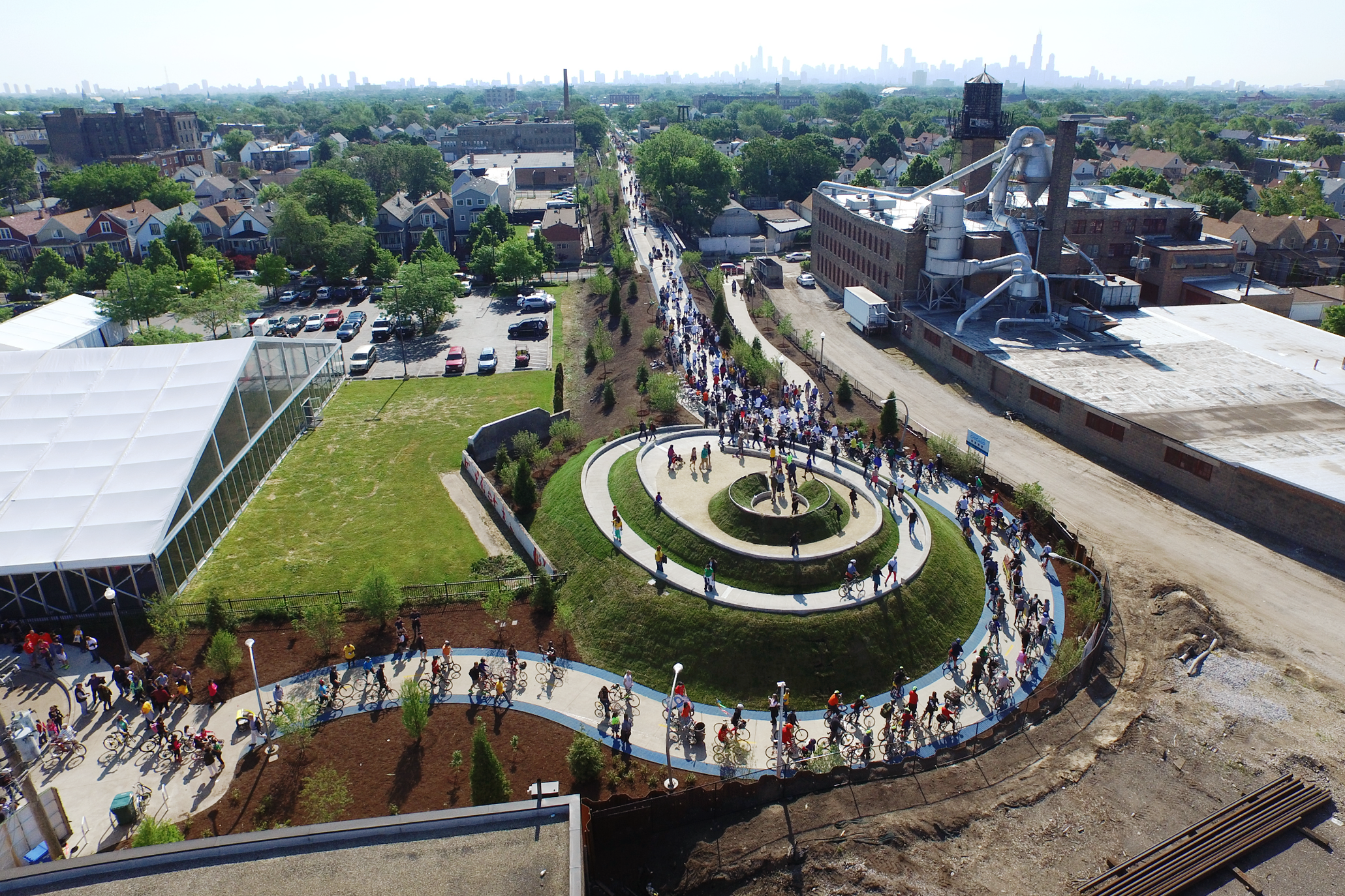 The 606 is a 2.7-mile long converted rail-line that runs through the center of Chicago. The project was inspired by the need to increase the amount of green space in Chicago, particularly the neighborhood of Logan Square. Traffic on the Bloomingdale Line, the former rail-line the 606 is built on, slowed down in the 1990s, turning it into a viable option for a public park. Plans for the project began in 2004, were finalized in June of 2013, and the first phase opened to the public in 2015. The park contains a trail for runners, event spaces, and a pedestrian path.