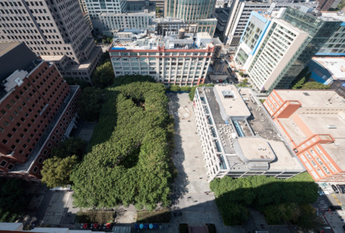 In some sections of Lost Man Creek, there are smaller trees which signify those that have been cut down, bringing into question the problem of deforestation and time and scale required to preserve these trees. The deck leads people up to look over the small forest from above– a perspective that creates a striking contrast between the natural growth of the forest trees and the trees already planted in Metrotech Commons Square, which are arranged in a perfectly-straight line.