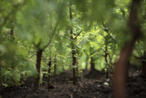 The work contains 4,000 Dawn Redwood trees that were recreated according to the same configuration of trees in Redwood National Park in California. It took about a year of planning the exhibit before installation could begin. Finch worked with Save the Redwoods League to find a 790-acre section of the forest to recreate. The team worked from topographical and canopy height maps to figure out how many trees they need for the installation, as well as a tree farm to grow these trees. They also consulted with soil and irrigation experts to determine how best to create an environment in which the miniature forest could thrive throughout the exhibition period. Over the course of two weeks, volunteers helped plant section by section, based on the maps and the grid. “It was a very specific process because each tree is in a spot that correlates to how the tree is out in the [related] section of Redwood Forest,” Enderby said.