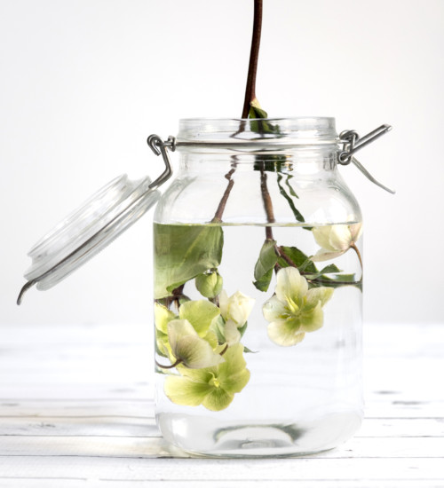 Unfortunately, for all their beauty and strength through winter, hellebores are a fragile group when cut for bouquets, and within a few hours often start to droop, their heads hanging perilously close to the surface they’re sitting on. When this starts to happen, Ella recommends getting them into to cold water as quickly as possible and submerging them completely, petal to stem (and no, we’re not joking this time). Leave them in water for ten to fifteen minutes, and then place them in an extra cool part of the refrigerator, in a glass with plenty of cold water. Ideally, hellebores will sit in there until needed again, but it’s best to at least give them an hour’s rest in the cold and dark. Keep the bouquet in as cool as spot as possible, as the heat works away at hellebores very quickly.