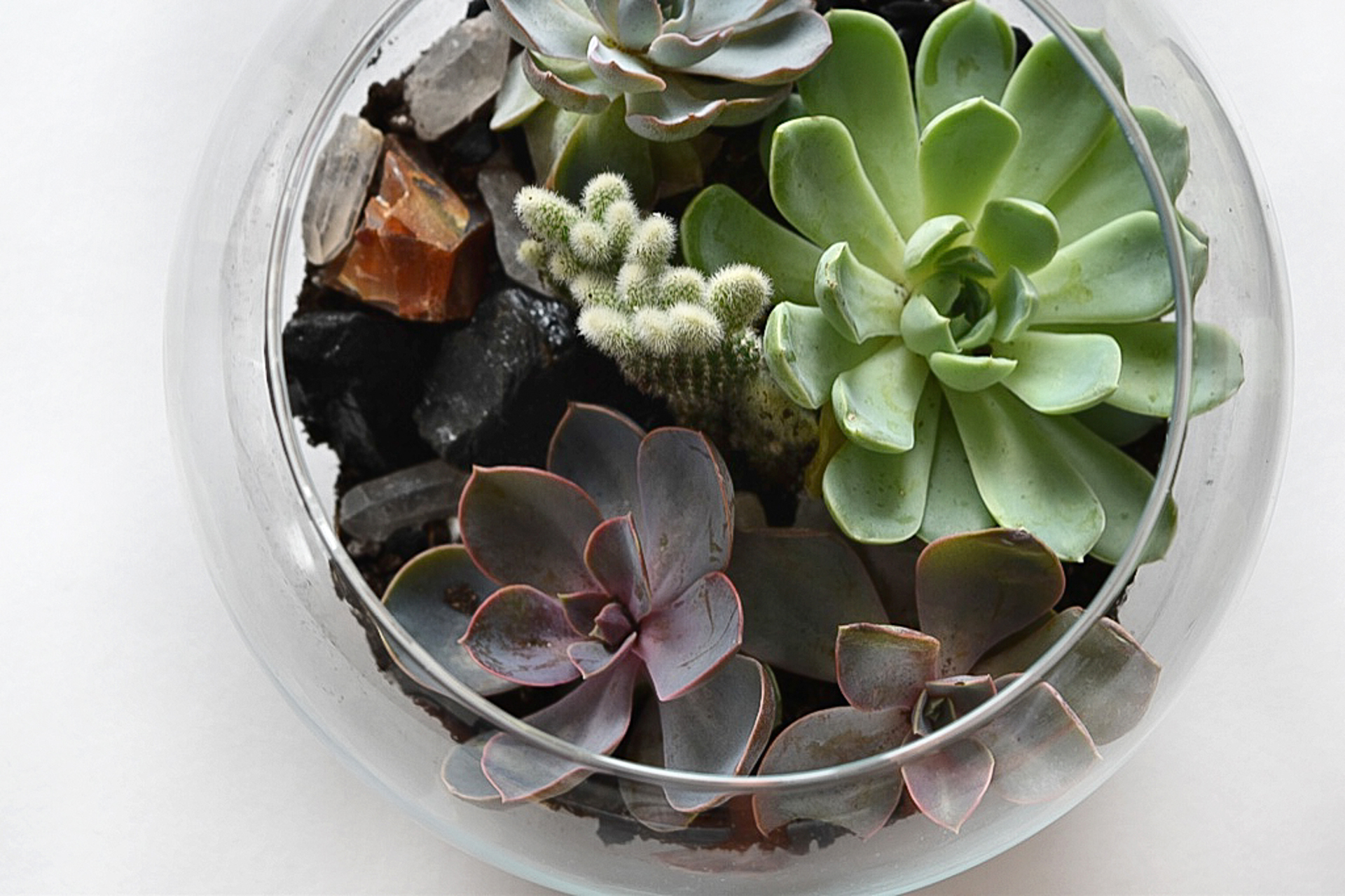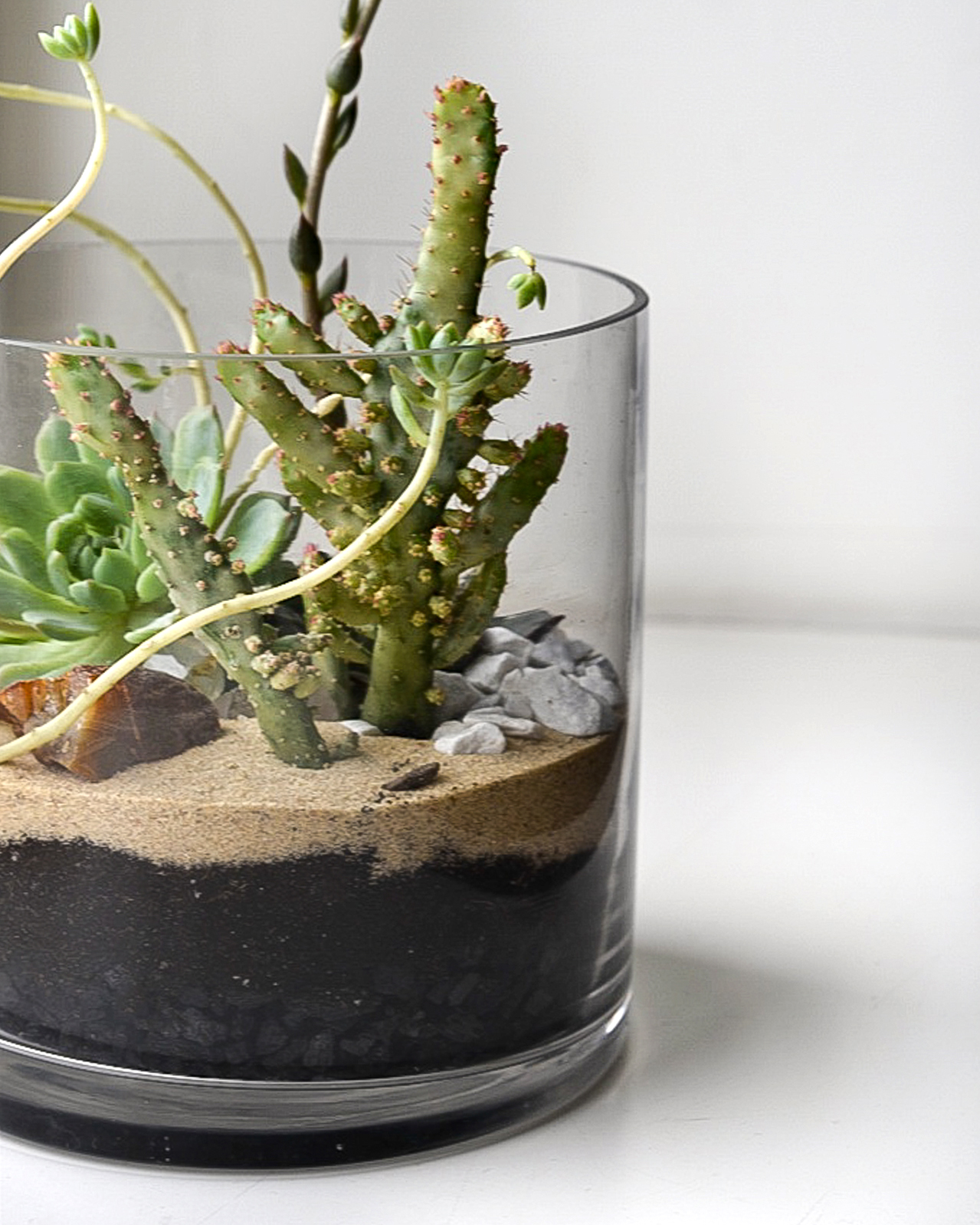 The sand that comes next is optional, but it seals up the composition in an aesthetically-pleasing manner (this is what separates the novices from the pros). Pebbles and crystals can be added as decorative finishes around whatever varieties of succulents and cacti you chose to arrange.