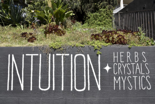 The message is painted in slender white letters along a low, black concrete wall; beside it, an arrow directs visitors towards a stairway camouflaged between a tall wall and an overgrown garden. At the top is simply-built home, inside of which resides one of Los Angeles’s best resources for all things metaphysical: House of Intuition.