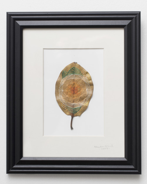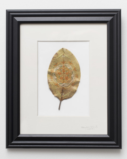 HR: The really great thing about a magnolia leaf is that it’s a waxy leaf and it’s very thick. I have to search for leaves that are yellow, the ones that have already fallen off the tree and are now in the process of death. One I start embroidering it, and the leaf actually dries around the embroidery. With it being yellow and still alive, they give me a little more give. Sometimes if the leaf is super curved, I will put it in a book for half a day. I like it to dry in its natural shape, but I also have to consider getting it into a frame, so I have to flatten it first so that it won’t crack. It’s a hard leaf, so it’s not like a maple that’s going to crumble in your hands.