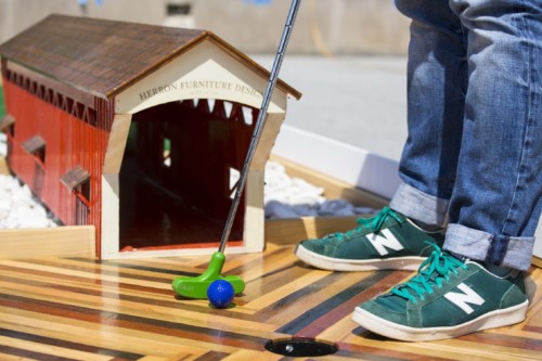 The exhibit runs May 28-September 3rd, and includes an impressive array of inspiration points that take cues from nature and popular culture alike. The museum invited Indiana artists to design art for each hole in the 18-hole golf course, which is located in the IMA’s Sculpture Court. Guests can play past Utah’s red Canyonlands, African plains (populated by a ring-tailed lemur, a cheetah, and a yellow-billed hornbill), a molten carpet of hot lava, melting glaciers, a Japanese-inspired garden with pagoda and pale stones, and features recognizable in Indiana’s geography, including an Indiana wetland with fiberglass cattails, fish-like obstacles, and a beaver lodge. (Another artwork depicts the White River, which in real life you can traverse by canoe or even a gondola as it winds through Indianapolis.)