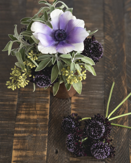 “They have a cool movement in their shape,” Ella told GC. “They pair well with fiddleheads for that reason.” Small buttons of color, scabiosa also pairs well with other country garden types in the spirit of fiddleheads, like sweet peas or roses. “They will bloom slowly, so if you need them to last a long time, you can buy them still closed,” Ella advised. She used them earlier this year for our floral salon, which required advance prep– and they still looked perfect the next day. (Look for them in the top image– they are the small black accents.)