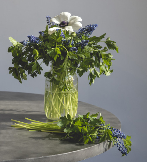 When using them in arrangements, be aware that grape hyacinth tends to have shorter stems, and therefore work best in smaller arrangements as an accent. Their color pairs well with bright, seasonal greens and other fresh hues that speak to early Spring’s new life; think: plush cottage roses or pale ranunculus. We mixed ours with a bunch of parsley from the store and a single anemone for a very affordable tabletop bouquet that feels cheerful and very of the season.