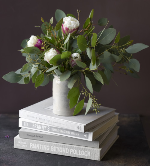 While it may be tempting to buy two bunches of flowers (more flowers = better, right?), your best bet is to invest in one bloom and one green filler. As their name suggests, fillers tend to take up space and are usually pretty cheap. If you live in a city with a bustling flower market, you can probably get a entire bunch of greens for about $5– and you’ll probably wind up with way more than you need, in which case you hang the rest upside down and dry them for long-lasting décor. (Not sure what kind of greens are right for you? Check out our guide to the most common three out there.)