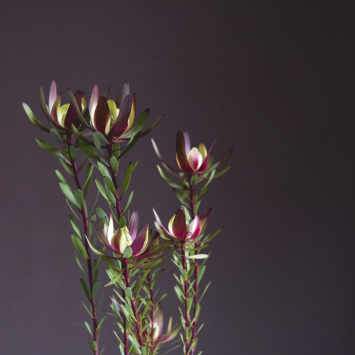 Pairing with leucadendron is easily if you simply draw on its own qualities: leucadendron handsomely offsets King Protea, from its own family; leucadedron fits in easily with other hues from the sunset family; and with its bright leaves, leucadendron complements fresh, light greenery. Ella adds, “I love to mix it with sunflower or burgundy cymbidium orchid, or even anthurium and birds of paradise…”