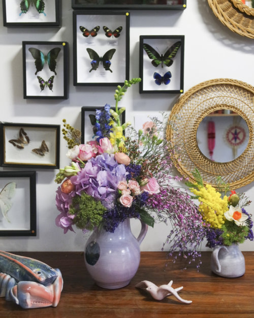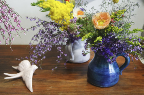 Today, he brought together an eye-popping assortment that was nothing short of miraculous in this gloomy weather: a bouquet composed of dusty pink and parma hydrangeas, blue delphinium, soft yellow snapdragon, hot pink broom, delicate narcissus, anemone, and poppy, all arranged in a carefully-executed symphony of colors, shapes, and intensity. As he placed the flowers carefully in my beloved Cloutier vase – affectionately remembering to assemble a couple of mini-bouquets for the two matching milk pots –, I realized that the sun was out and that my visual harmony was now complete.