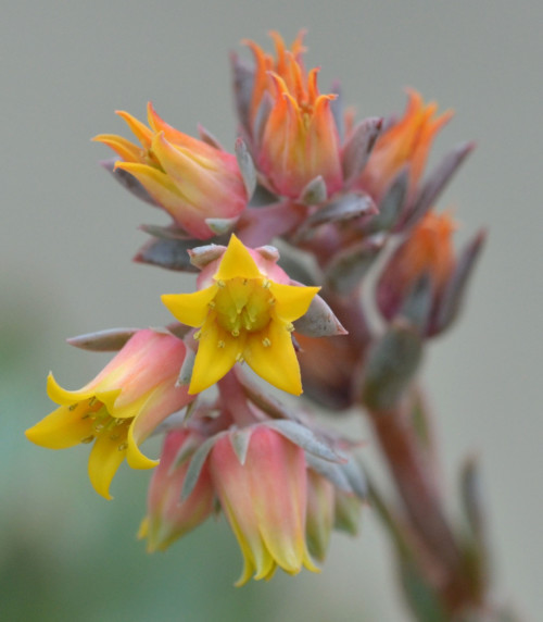 Big milky-blue rosettes with pinkish highlights, named for a 1930’s German succulent grower. In summer, yellow-tipped, coral-pink flowers appear on foot-tall spikes, up to six times a year.