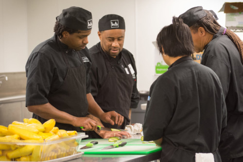 Participants in the program partner with restaurants during their internship, and are given job placement support when they finish the program. Operating parallel to this system is Strong Food, L.A. Kitchen’s for-profit facet that secures food service contracts and hires graduates of the L.A. Kitchen program.
