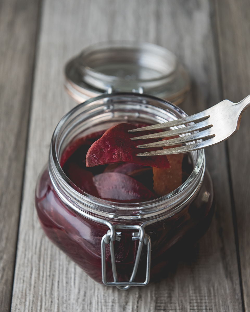 - Brew the tea in 1.5 quarts of water according to the package instructions. Add the beets and salt and cool to room temperature in a large glass bowl. Add the orange peel and cinnamon stick. Place a smaller bowl on top so that the beets along with the flavorings are completely submerged.