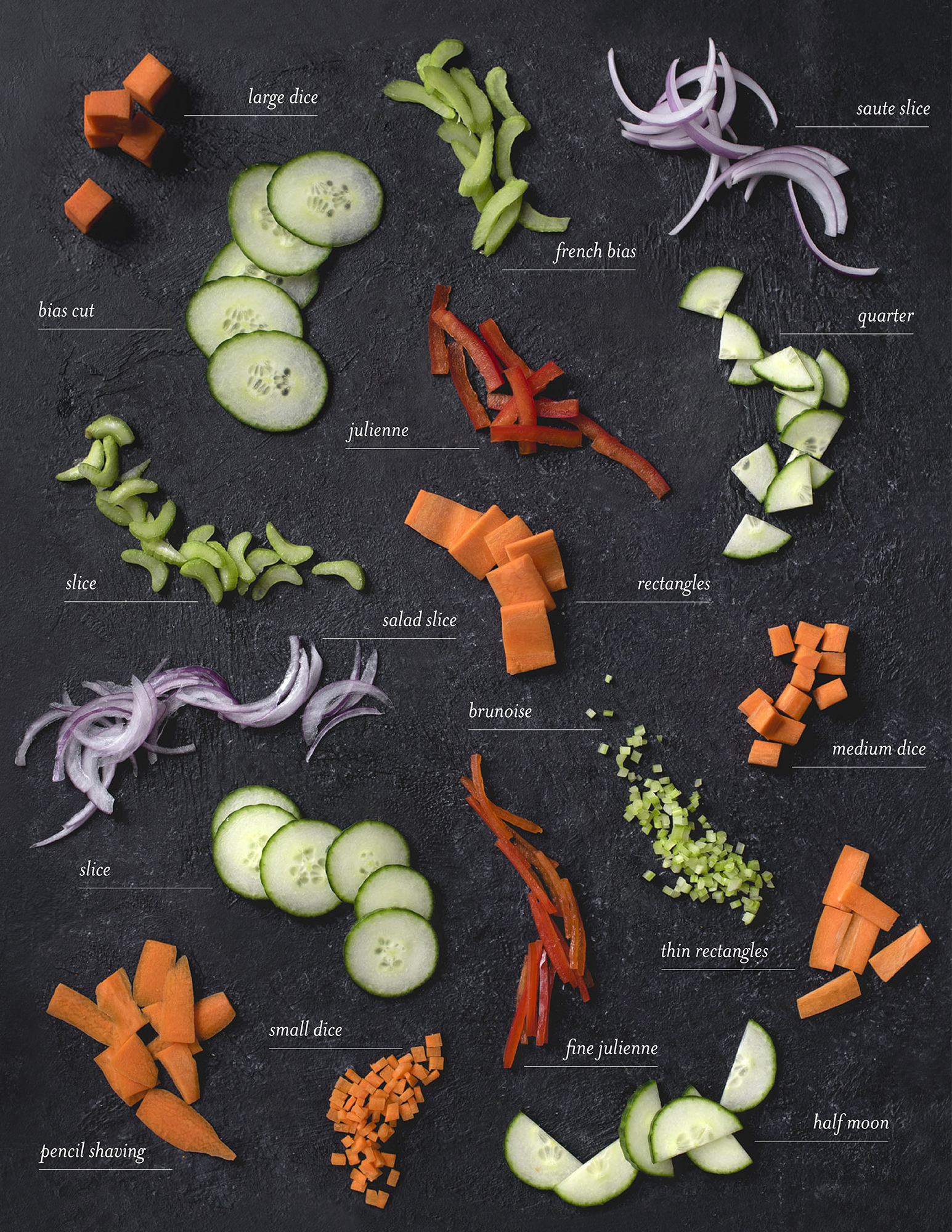 “Slicing on the bias”, “julienne”, “medium dice”– we’ve all heard these culinary terms before, but what does each of them actually mean, according to textbooks?
