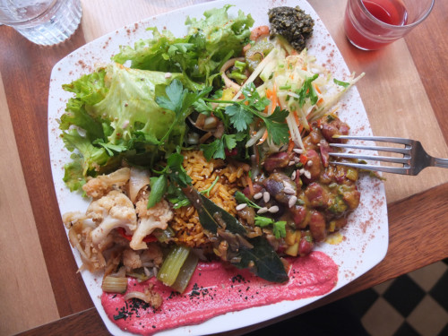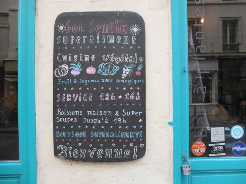 The cheery turquoise storefront offers a visual jolt of energy on a narrow Parisian street near the Canal Saint-Martin. Here is Sol Semilla, one of the city’s forerunners of organic vegan cuisine, and if the façade makes passers-by stop in their tracks, it’s just as well that it should: the café is on a culinary mission, after all.
