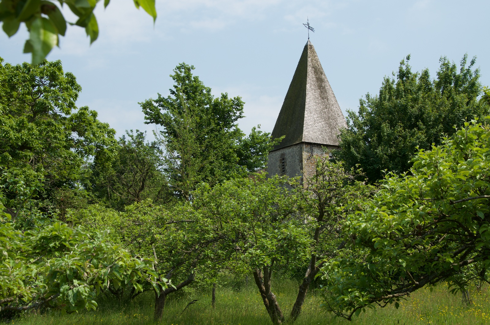 Many crumbling walls, outbuildings, and an old tool shed that Virginia initially used as a writing room dotted the property when they first arrived. An orchard on the far side of the site was bordered by a 12th-century church whose steeple poked up over the trees. Leonard describes the landscape as having all the things he liked: