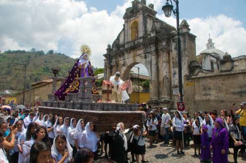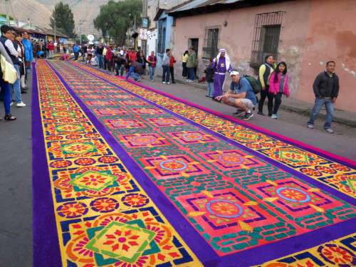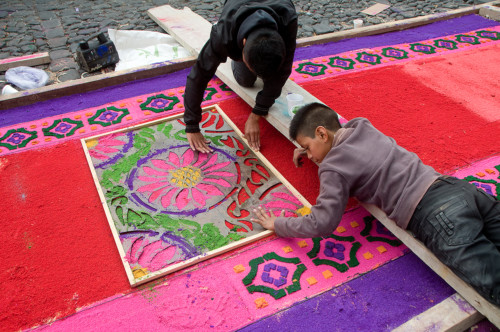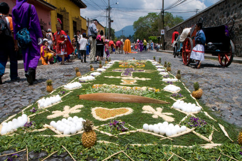 Every year during Holy Week, amazing carpets composed of flowers, vegetables, fruits and dyed sawdust adorn the streets of Antigua, Guatemala– a lovely Colonial city home to Latin America’s most famous Easter celebration.