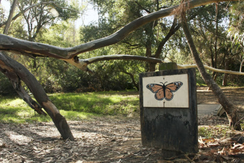 Monarch butterflies make a yearly migration to this wintering spot with the help of a built-in magnetic compass– the same bio-adapted feature that helps birds make their own annual migrations. Escaping cold winter temperatures, monarchs seek wind-protected areas with access to water to roost on trees—namely eucalyptus, Monterrey Pine, and Monterrey Cypress. Prior to the 1920s, monarchs were not regular visitors to this area of coastal California. Their native winter territory lies further south, in and around Baja, Mexico. It is believed that some odd weather patterns first brought a few wayward monarchs to the grove in Goleta, which they found favorable.