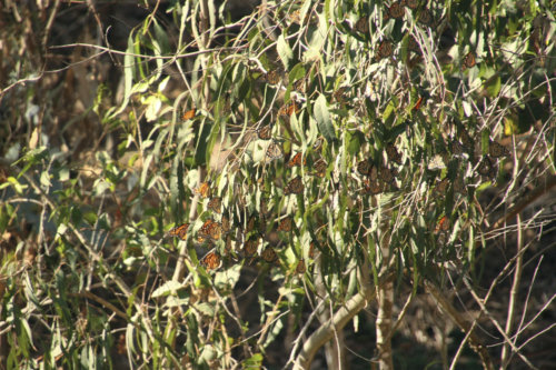 The scene at the reserve is spectacular—meandering trails lead visitors through shaded soft greens of shedding eucalyptus, acacia trees, and coastal sage. Moist ocean air mixes with the clean scent of eucalyptus oil. Slowly you begin to see them—just one or two at first, and perhaps a small flutter here, another there. Looking up, trees are covered and alive with orange- and black-winged creatures. Look closely—the muted oranges and browns of closed wings can look like clumps of dry leaves. With the right timing, tens of thousands of butterflies may be on view, resting wing to wing, making branches heavy and covering trunks.